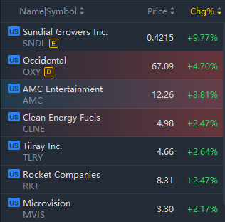 Meme stocks soared in morning trading, with Sundial Growers rising nearly 10% and AMC rising nearly 4%.