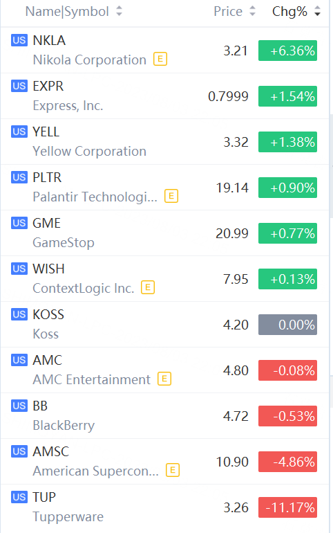 Meme stocks mixed in morning trading on Thursday, with Nikola stock rising over 6% while Tupperware stock dropping 11.17%.