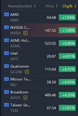 Major semiconductor stocks cheered up in morning trading; AMD and NVIDIA Corp soared over 7%.