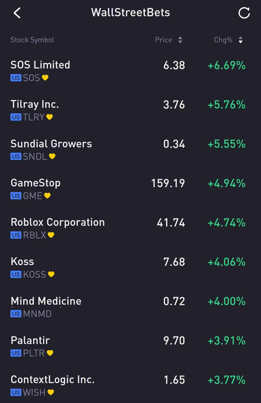 Meme stocks gained in morning trading. SOS Limited, Tilray, Sundial Growers, GameStop, Roblox, Koss, Palantir and Contextlogic climbed between 3% and 7%.