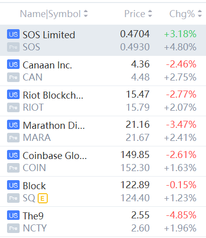 Coinbase, Block, Riot Blockchain, Canaan, Marathon Digital, SOS Limited and The9 rose between 1% and 5%.