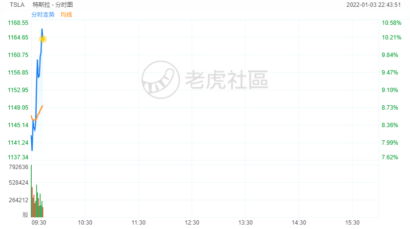 1月3日,特斯拉涨幅持续扩大,现涨超10%,股价报1166美元。