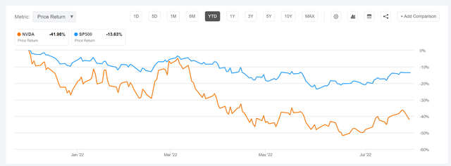 Nvidia stock is down about 40% YTD, versus a loss of about 15% for the SPX.