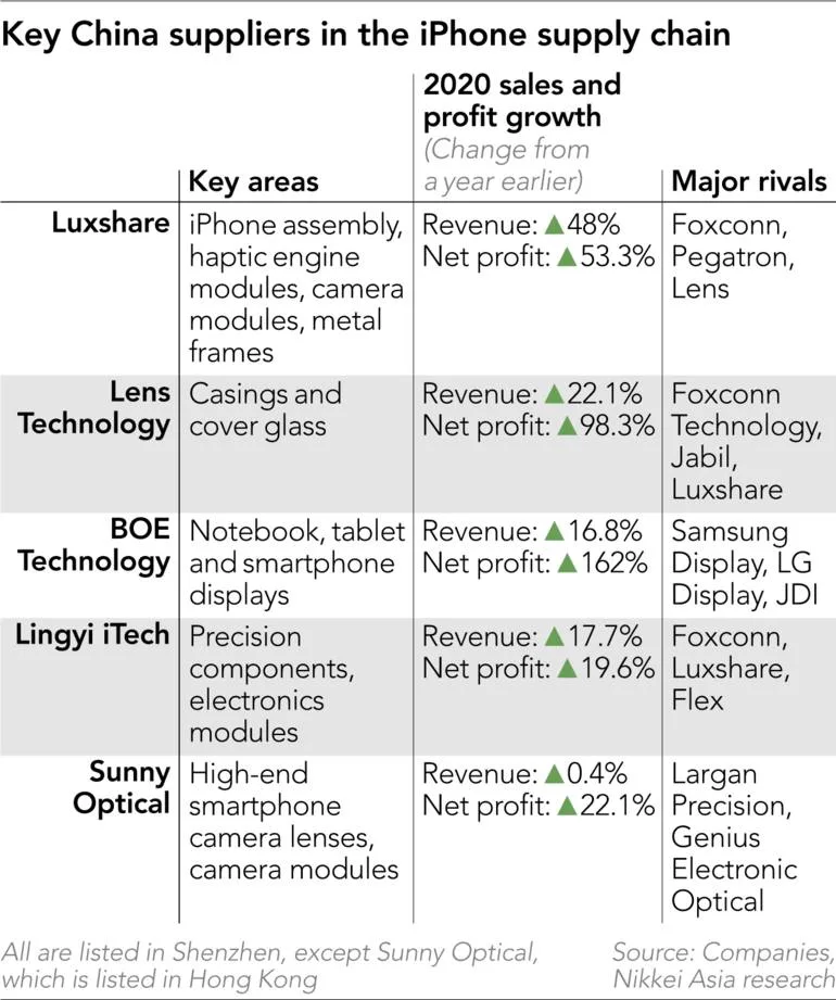 Eric Tseng, chief analyst with Isaiah Research, said companies like Luxshare, Goertek, Wingtech and Lens have all been gaining orders in the Apple supply chain recently. The rise of Luxshare -- which started out providing relatively simple components for iPhones just a few years ago -- is likely to be a bargaining chip for Apple against its longtime manufacturing partner Foxconn, he added.