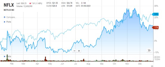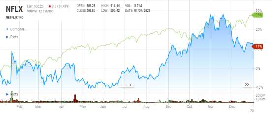 再往上追溯,在2021年,奈飞通过推出《鱿鱼游戏》等一系列热门的影视剧成功收获了一大批“粉丝”,业绩也因此受益得到了一定的提振,股价全年上涨了11%。但考虑到标普500指数在21年全年涨幅达到28%,且以科技股为主的纳斯达克综合指数全年涨幅也达到23%的背景下,奈飞的股票在2021年里的表现并不“及格”。