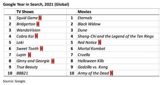 在2021年里,奈飞推出了一系列精彩的节目内容。根据谷歌热门搜索榜单的统计,搜索次数排名前10的电视剧集中,有6部属于奈飞的原创剧集。其中,排名第一的就是广为人知的《鱿鱼游戏》,而奈飞的另一部剧集《布里奇顿》则名列第二。