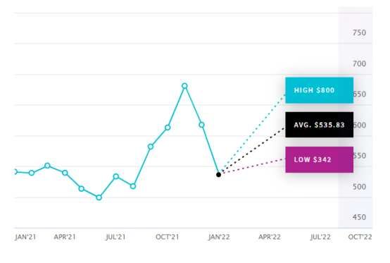 据相关统计,在过去3个月内,分析师发布对奈飞未来一年的目标价中,平均值为535.83美元,最高值为800美元,最低值342美元。