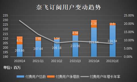在四季度中,虽然奈飞订阅数的净增量打破市场预期的813万,但要知道,在第三季度的财报中,管理层曾乐观预计公司在第四季度的新增用户将达到850万。智通财经APP注意到,订阅增速的下降还反映在用户数增长年率中,在2020年第四季度时,奈飞的订阅用户数增长率达到惊人的21.9%,然而进入到2021年后,增长率已经较早时的两位数下降到个位数。而在管理层给出的第一季度最新指引中,其用户数增长年率仅为8%,较去年同期下降了5.6个百分点。