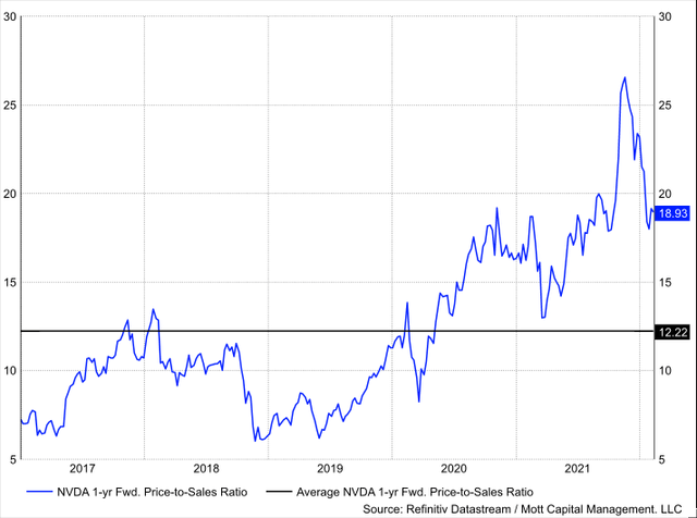 From 2017 until the end of 2019, Nvidia typically averaged a one-year forward price to sales multiple of nine, which peaked around 12-13 times sales. However, since the pandemic, the average has risen to 12, and the stock is now trading at 19 times 1-yr forward sales. At this point, the shares are trading at nearly double their pre-COVID historical average.