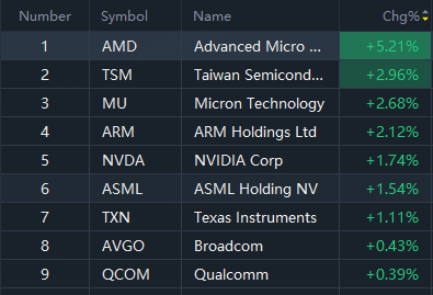 Semiconductor stocks gained in Wednesday trading. AMD rose 5.2%; TSMC rose 3%; Micron rose 2.7%; Arm rose 2.1%; Nvidia rose 1.7%.