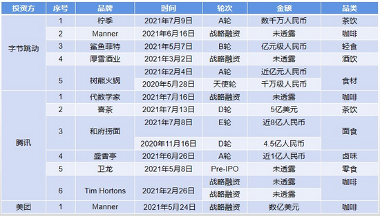 早前,腾讯分别在今年2月、7月,先后投资了Tim Hortons和代数学家咖啡两个品牌。5月24日,美团龙珠独家投资咖啡品牌Manner数亿美元。紧接着,字节跳动也在6月注资了Manner。