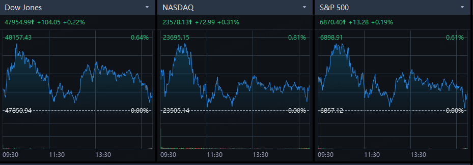 The Dow Jones Industrial Average rose 104.05 points, or 0.22%, to 47,954.99, the S&P 500 gained 13.28 points, or 0.19%, to 6,870.40 and the Nasdaq Composite gained 72.99 points, or 0.31%, to 23,578.13. SanDisk Corp. up 7%; Baidu up 6%; Adobe, Micron Technology up 5%; Meta Platforms, Inc. up 2%.