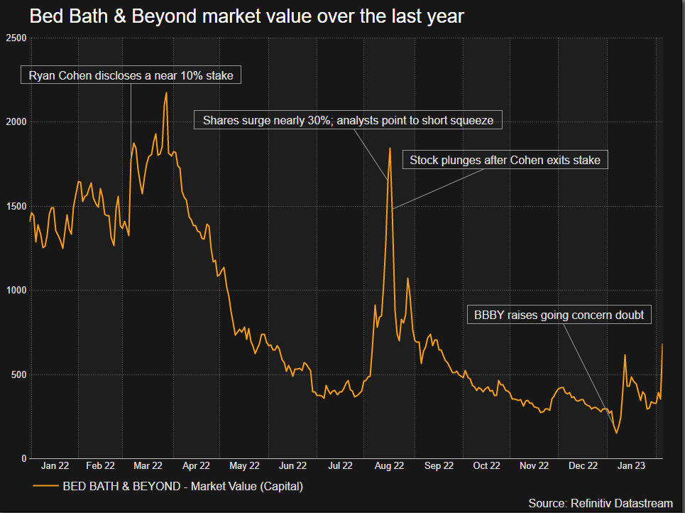 A part of the meme stock phenomenon, Bed Bath & Beyond's shares surged to as high as $30 last year when activist investor Ryan Cohen took a stake in the company and pushed for changes.
