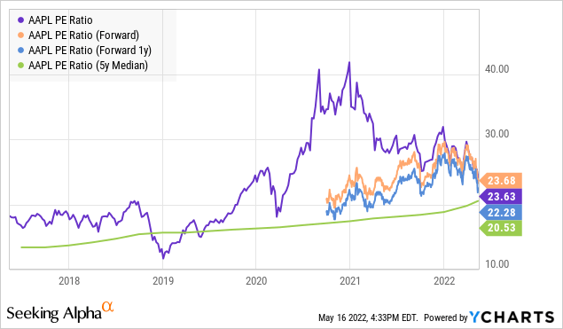 In our view, AAPL is overvalued because we see the current growth headwinds extending through next year and leading to weaker than expected sales, margins, and earnings. The stock trading at a forward P/E of 24x appears expensive, particularly in the subdued growth outlook. The 1-year forward P/E closer to 22.5x based on the consensus 2023 EPS is also above the stock's 5-year average for the metric closer to 20.5x.