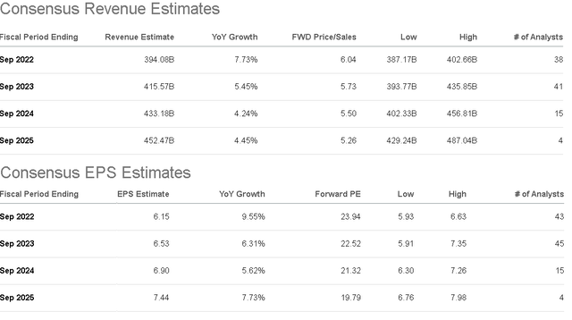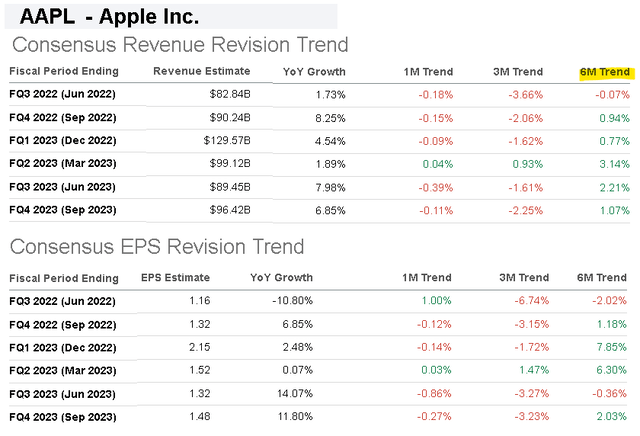 What stands out to us when looking at AAPL is that even with the major macro developments over the last few months, the consensus estimates have been relatively resilient. For example, the market forecast for AAPL's fiscal Q3 revenue at $82.8 billion, representing a 1.7% y/y growth has been lowered by just 3.7% over the last 90 days. This apparently includes a loss of around 1.5% to total sales from business in Russia as noted in the conference call. Based on quarterly estimates through Q4 2023, consensus revenue and EPS are still up for nearly every quarter compared to levels six months ago.