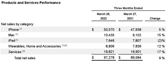 This was a record Q2 for the company which continues to benefit from an ongoing shift towards a more services-based model beyond core iPhone and Mac hardware. For context, services which include advertising, AppStore, AppleCare+, cloud, digital content, and payment services now represent 20% of total revenues, up from 19% last year. Nevertheless, with the exception of the "iPad", all major sales categories saw growth.