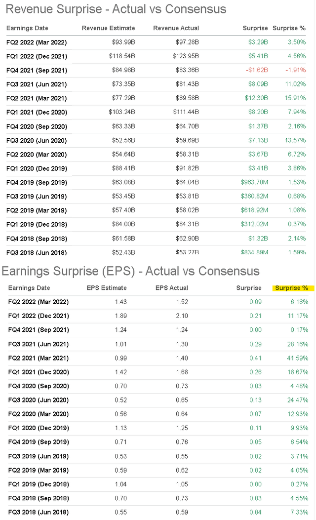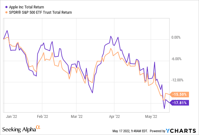 One of the headlines from the last earnings report was management's comments indicating some near-term headwinds leading to softer guidance. From the conference call, Apple cited everything from ongoing supply chain disruptions and the latest Covid surge in China limiting economic activity in the region as clouding the outlook. Separately, the Russia-Ukraine crisis has forced the company to pause all sales in Russia with a direct impact on growth for the rest of the year. All in all, the setup is for a deceleration into Q3 and the rest of 2022.