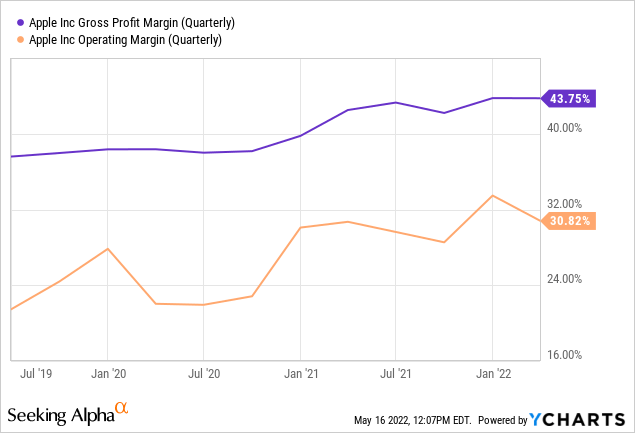 The result on the services side has led to a trend higher in margins over the last several years with the company more profitable than ever. The gross margin reached 43.7% compared to 42.5% in Q2 2021. On the other hand, the operating margin this quarter at 30.8% was roughly flat from 30.7% last year. This considers higher spending from Apple across R&D and SG&A as total expenses climbed 19% y/y.