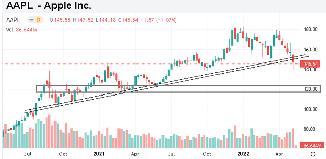 From a technical perspective and the charts, it's clear that shares of AAPL have broken down a trend line that was in place since mid-2020. The trading action here mirrors the broader market that has the bears in control. In many ways, the next direction the stock takes is going to be a macro call.