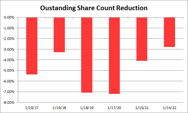 For Apple though, the more important item to look at for a potential raise is how the share count has trended. Over the years, management and the board have favored the buyback, so we haven't seen any really dramatic dividend increases. In the chart below, you can see how Apple's outstanding share count has come down for a rough 12- month period in recent years, based on the date given in the fiscal Q1 10-Q filings.