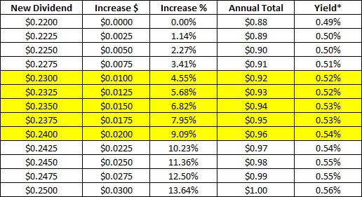 As my readers know, I provide a prediction table each year to show what a potential dividend raise could look like. That graphic can be seen below, with my personal prediction range in yellow. As we've seen in past years, I think we'll see another slow and steady raise, probably in the mid-single digits. Since we've averaged a split-adjusted penny and a half raise per year over the past six years, I'm going to say that's the likeliest outcome here as well. Perhaps investors could get a little more if the board wants the dividend increase to be more than the current US inflation rate.