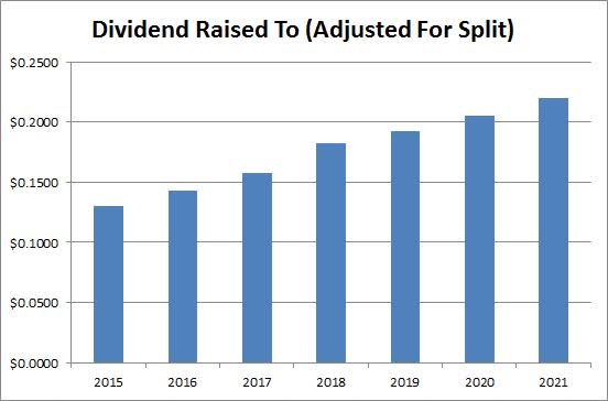 Over this six-year period, the split-adjusted dividend rose from $0.13 a quarter to $0.22. That's an average of a penny and a half each year, and the last three years have all seen increases in the mid-single digits, with 2021's increase of 7.32% being the highest of those three. The annual yield sat at just 0.49% as of Monday's close, which is down a bit from the 0.67% figure seen when I did my preview last year. This yield also looks much less impressive when you consider how much fixed income rates have risen over the past year.