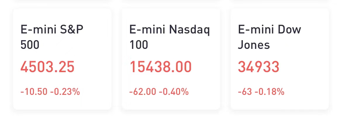At 8:50 a.m. ET, Dow e-minis were down 63 points, or 0.18%, S&P 500 e-minis were down 10.5 points, or 0.23%, and Nasdaq 100 e-minis were down 62 points, or 0.40%.
