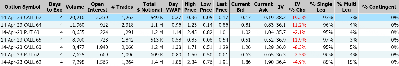 苹果周一下跌1.6%,报162.03美元。期权合约成交73.11万张,看涨期权占全部期权交易的55%。2023年4月14日到期行权价为162.50美元看涨期权的成交量特别高,成交量为72,686张。