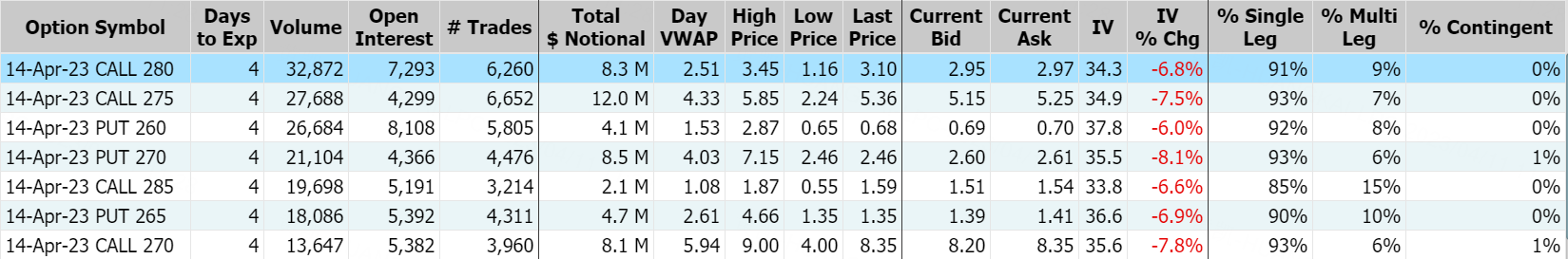 英伟达周一上涨2%,报275.79美元。期权合约成交73.11万张,看涨期权占全部期权交易的47%。2023年4月14日到期行权价为280美元看涨期权的成交量特别高,成交量为32,872张。