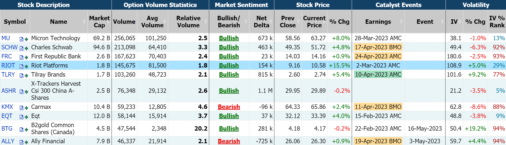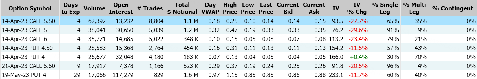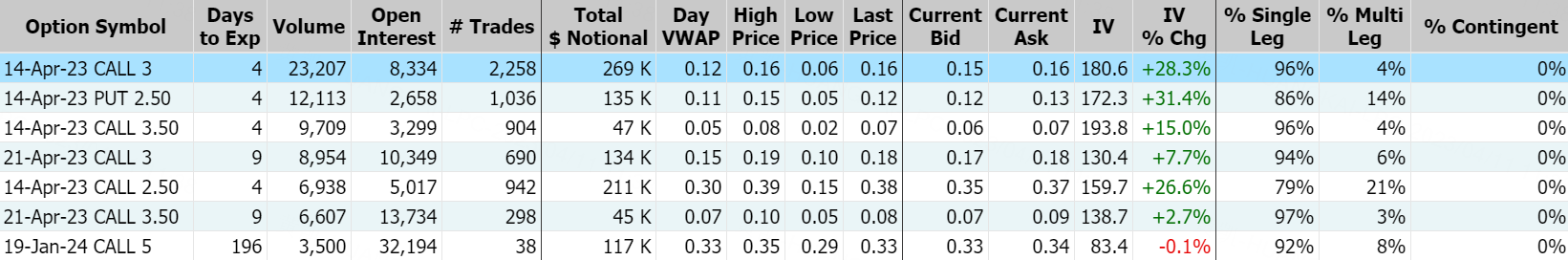 利好利空“同步”来袭,Tilray周一涨超5%,报2.74美元。但该股盘后下挫5%,投资者需要留意!Tilray2023年4月14日到期行权价为3美元看涨期权的成交量特别高,成交量为23,207张。