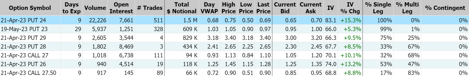 Ally周一涨近1%,报26.30美元。2023年4月21日到期行权价为24美元看跌期权的成交量特别高,成交量为22,226张。