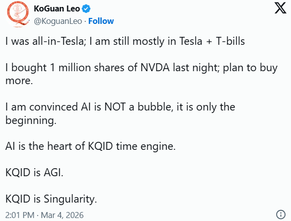 Despite growing skepticism of Elon Musk and Tesla, KoGuan said he remains mostly invested in Tesla and treasury bills, noting Tesla’s energy, Cybercap, and Teslabot are undervalued. He made his fortune with SHI International Corp. and has been buying Tesla since 2019.