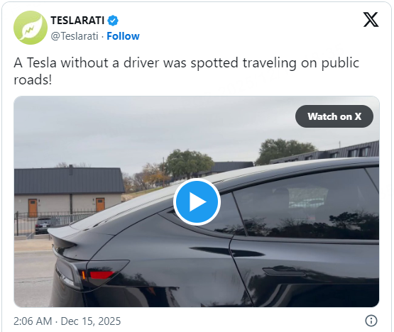 Two units were spotted, with the first being seen from the side and clearly showing no human beings inside the cabin of the Model Y Robotaxi: