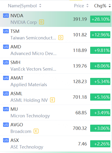 Other semiconductor makers also jumped. TSMC rose nearly 13%; AMD rose nearly 10%; Applied Materials, ASML rose over 5%; Broadcon, Micron rose over 3%.