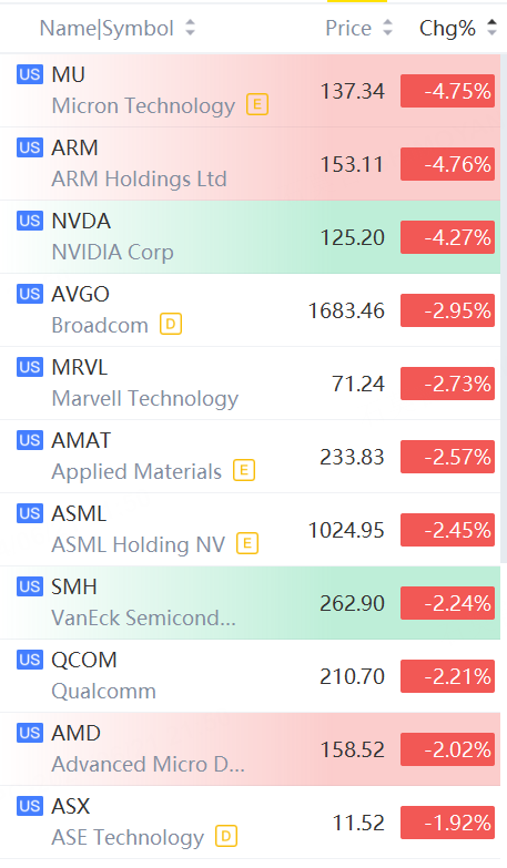 Semiconductor shares slid in morning trading. Micron Technology, Arm, Nvidia fell over 4%; Broadcom, Marvell, Qualcomm, AMD fell over 2%.