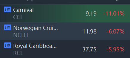 Cruise line stocks slumped in morning trading. Shares of cruise operators Norwegian Cruise Line, Carnival Corp and Royal Caribbean Cruises Ltd fell between 5% and 11%.