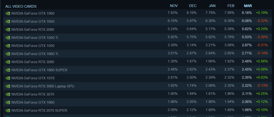 在3A大作汇聚的游戏平台Steam的统计中,排名最高的RTX 30系桌面显卡是位列第8的中端甜品卡RTX 3060,而排名第一的仍然是NVIDIA在六年前发售的GTX 1060。