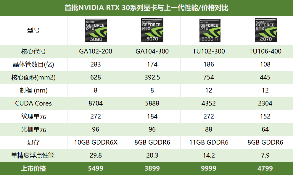 除了定位最高端旗舰的RTX 3090型号,RTX 3080和RTX 3070显卡的定价分别是5499元和3899元。作为对比,上一代显卡同样定位的型号RTX 2080和RTX 2070首发定价分别是6499元和4799元。
