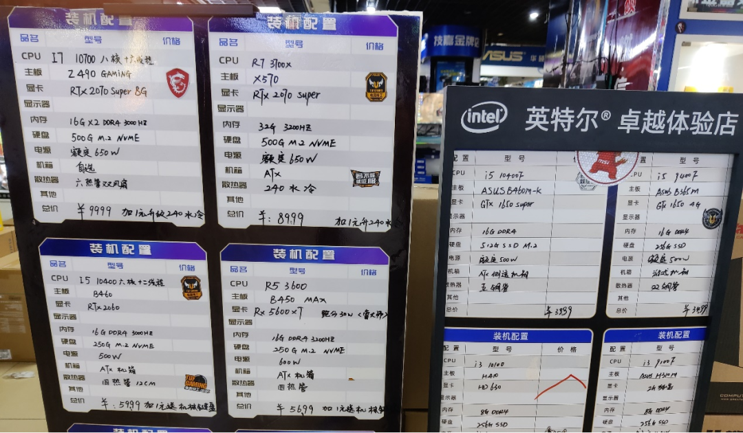 在位于广埠屯的电脑市场,奇偶派(jioupai)看到,一家商户展示的配置单上,还写着2019-2020年主流的Intel的10代酷睿和AMD的Zen2系列CPU,显卡也都是上一代的RTX 20系列和RX 5000系列产品,显然已经很久没有更新。