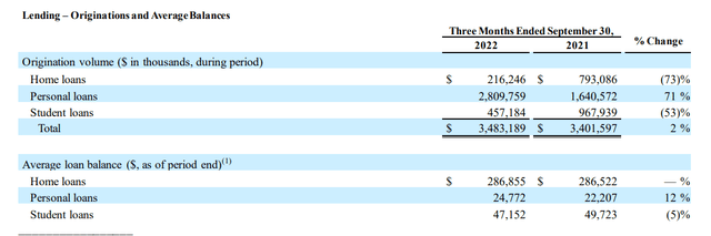 Repeated extensions of the Federal Student Loan Payment Moratorium have resulted in a major decline in SoFi's student loan business. Originations of student loans were a key driver of growth for SoFi before the pandemic, but the current situation has not helped the business very much. In the third-quarter, SoFi's student loan originations dropped 53% year over year to just $457.2M as borrowers have no reason to do student loan refinancings. Student loans accounted for an origination share of just 13% in Q3'22, down from more than twice this amount in the year-earlier period. Subsequent extensions of the student loan moratorium are set to suppress SoFi's origination business for even longer which could result in growing valuation pressure on SoFi's shares.
