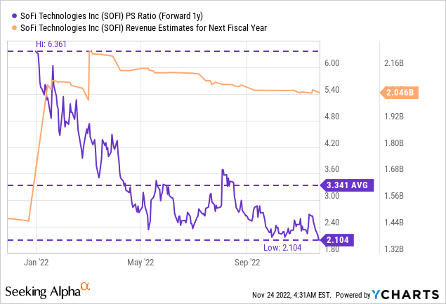 SoFi is currently expected to generate $2.05B in revenues in FY 2023, implying 34% year over year top line growth. This year, SoFi is projected to grow its revenues by 50%. The FinTech is also expected to be profitable in FY 2024. Based off of revenues (since SoFi is not yet profitable), shares have a P/S ratio of 2.1 X which is 37% below the 1-year average P/S ratio.
