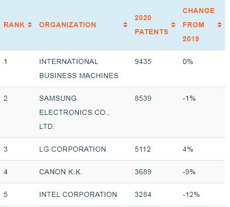 Intel has more than 60,000 patents total including thefifthmost in the world in 2020.