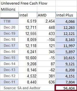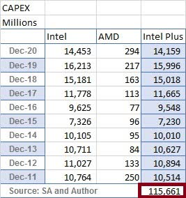 Why can Intel afford to invest so much in production? Since 2011, Intel's huge cash flow dwarfs AMD's by over $90 billion and that's after spending over $115 billion on CAPEX over the same time period.