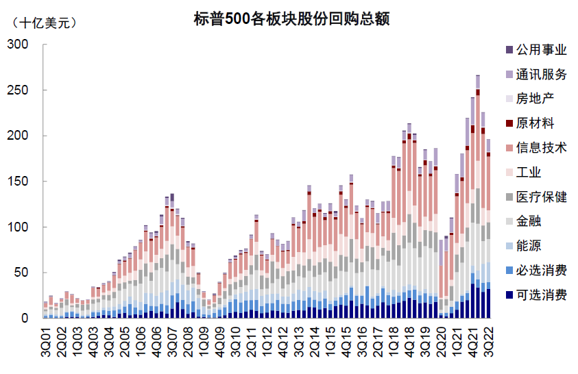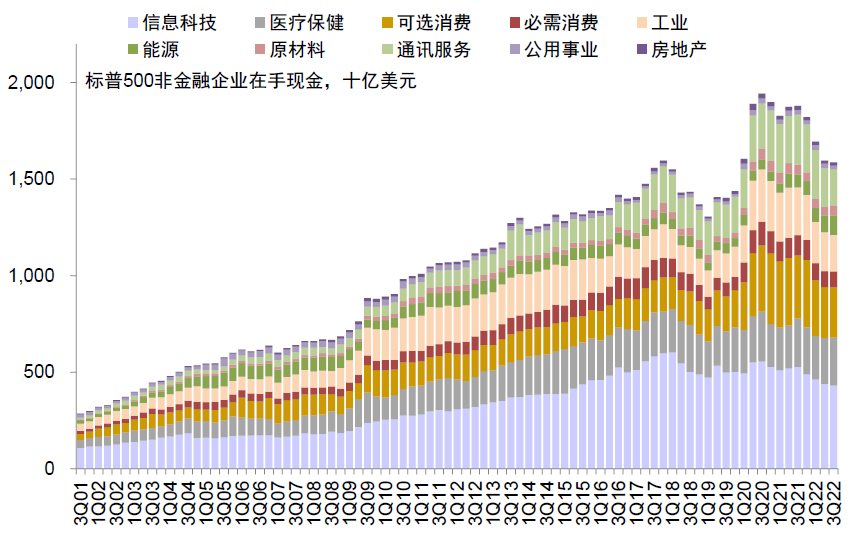 图表:三季度标普500非金融在手现金较上季度回落至1.59万亿美元,其中信息科技、可选消费仍占比较高