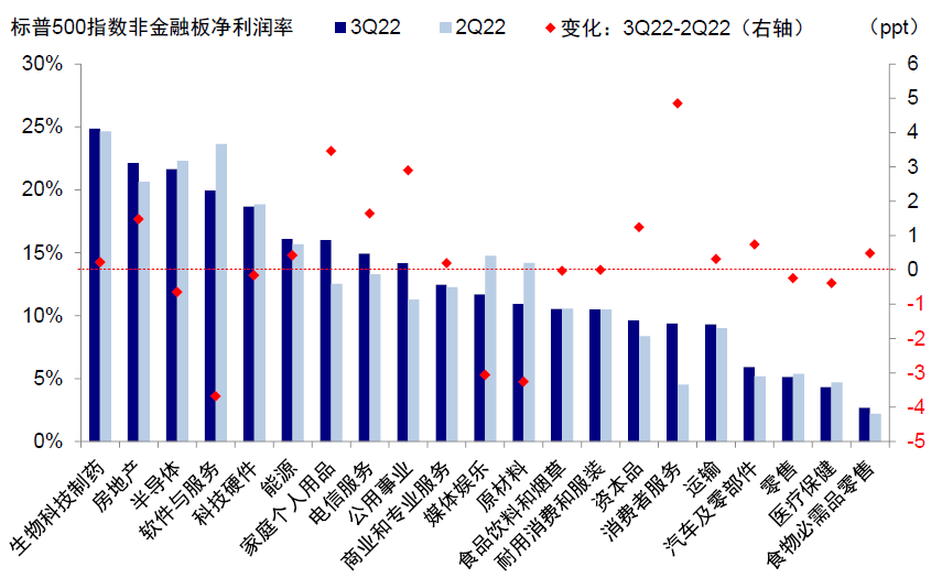 需求降温下收入继续回落,高成本继续挤压利润率。标普500三季收入同比增长9.3%(非金融9.6%),较二季度10.5%(非金融11.7%)继续回落。分板块看,相比二季度,汽车与零部件抬升明显,但生物制药及半导体显著回落。与此同时,高成本继续挤压净利润率,标普500三季度净利润率11.3%,较二季度11.7%继续回落;非金融净利润率同样从二季度的11.3%回落至三季度的11%。扣除能源板块后,三季度净利润率已回落至10.3%(vs. 二季度的10.6%)。分板块看,消费者服务、家庭个人用品、公用事业板块抬升明显,但软件与服务、原材料、媒体娱乐显著回落。
