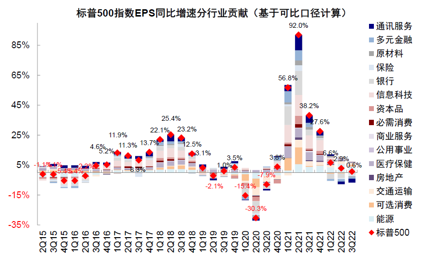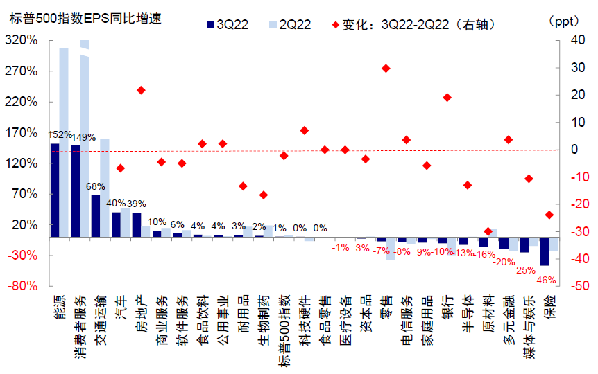 图表:三季度标普500 0.6%的EPS同比增速中,能源及可选消费贡献4.1和1.2ppt,通讯服务、多元金融、保险拖累2.5、1.3、1.2ppt