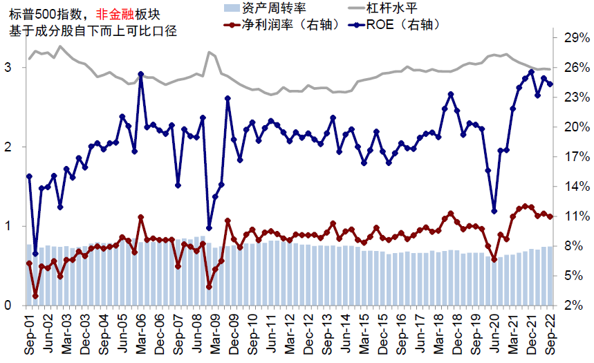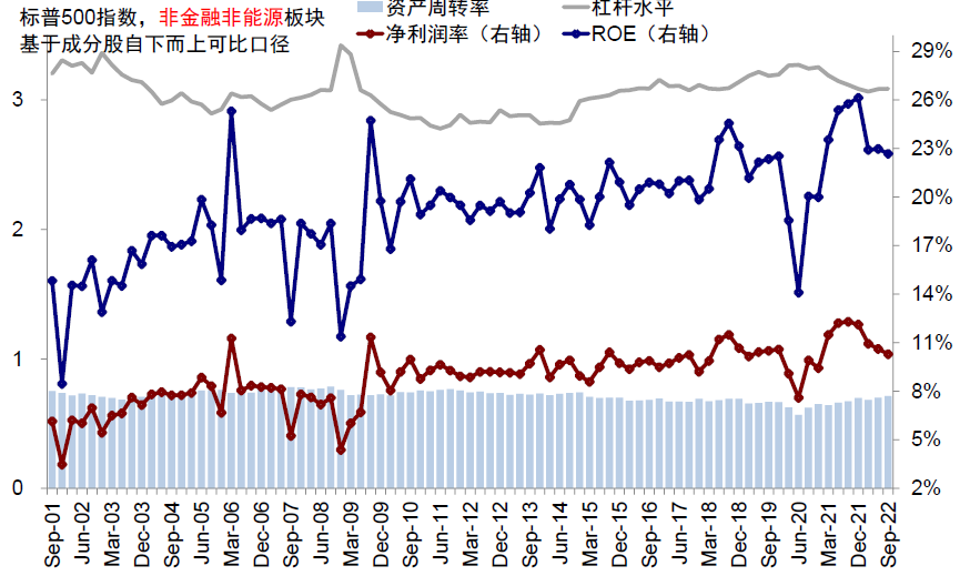 图表:三季度标普500非金融板块ROE回落至24.3%;净利润率回落、资产周转率及杠杆率基本不变