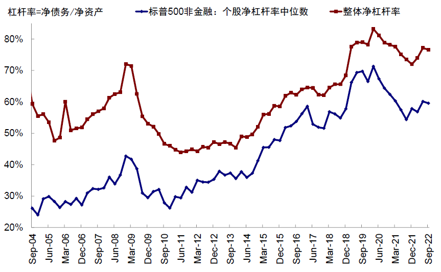 图表:三季度标普500非金融个股净杠杆率中位数维持在二季度的60%;整体净杠杆率亦是如此