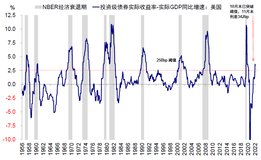 图表:投资级债券实际收益率 – 实际GDP同比增速利差10月突破阈值,11月末达342bp