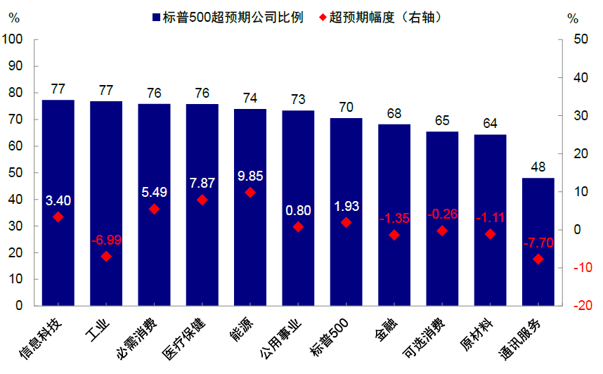 图表:信息科技、工业、必需消费、医疗保健仍有超过75%公司超预期;超预期幅度上,能源、医疗保健、必需消费最高